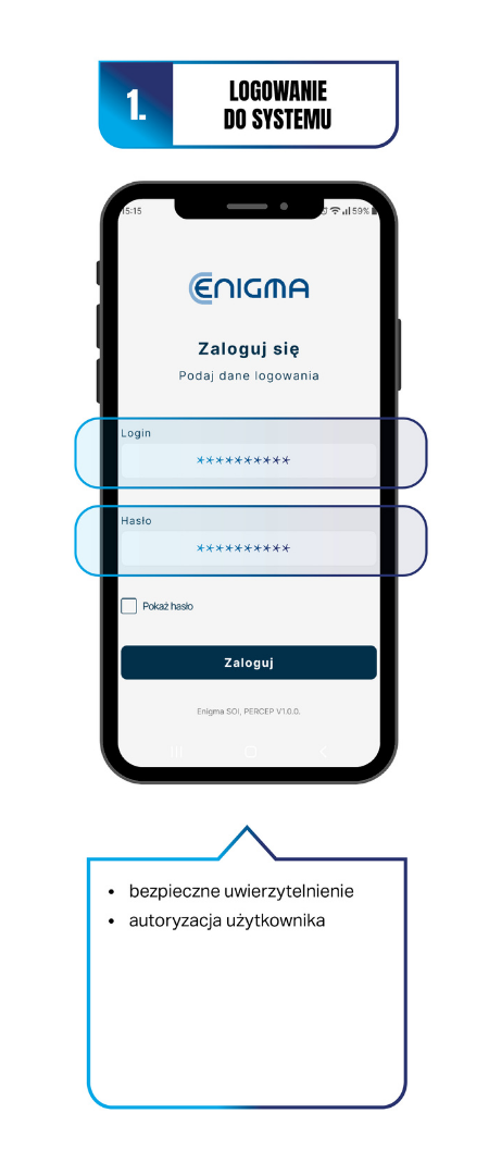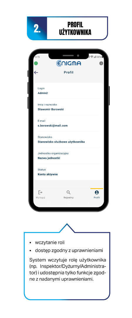 | Aplikacja mobilna (MOBILE) | Działa na dowolnym, bezpiecznym urządzeniu typu smartfon z systemem operacyjnym Android | Praca w terenie – weryfikacja osób i podczas interwencji |