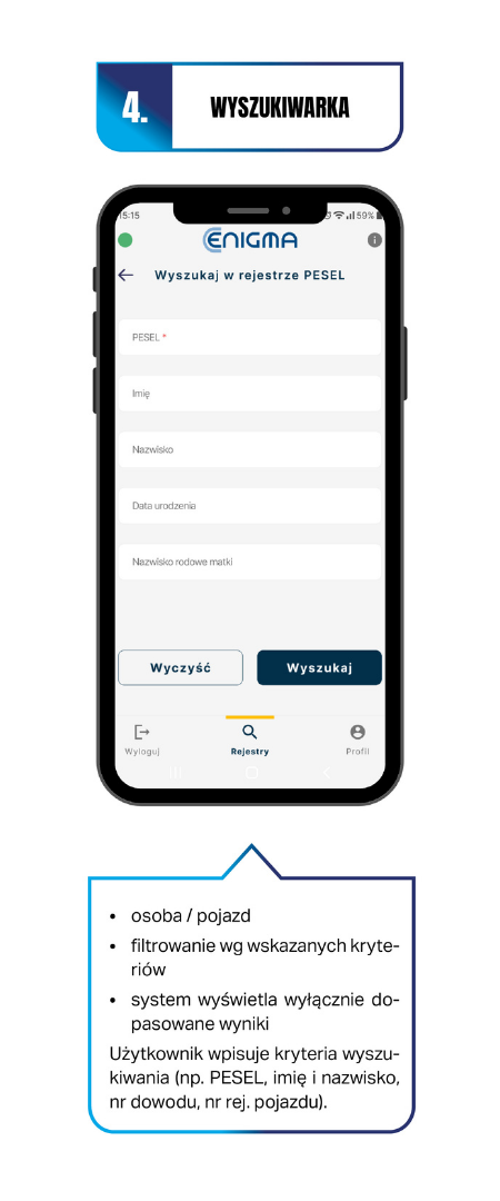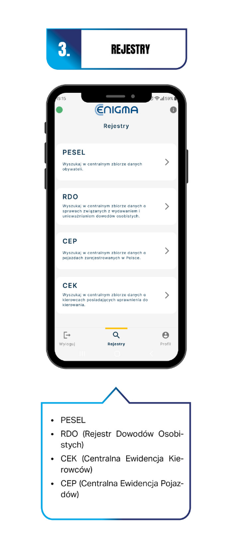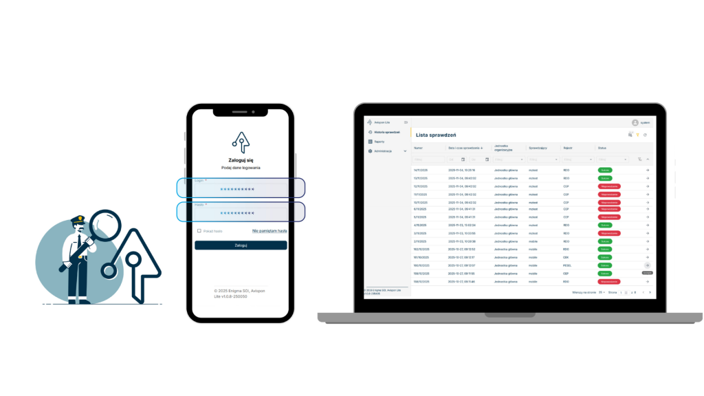 - Weryfikacja w czasie rzeczywistym – dostęp do systemów CEP, CEK, PESEL i RDO bezpośrednio z urządzenia mobilnego.
